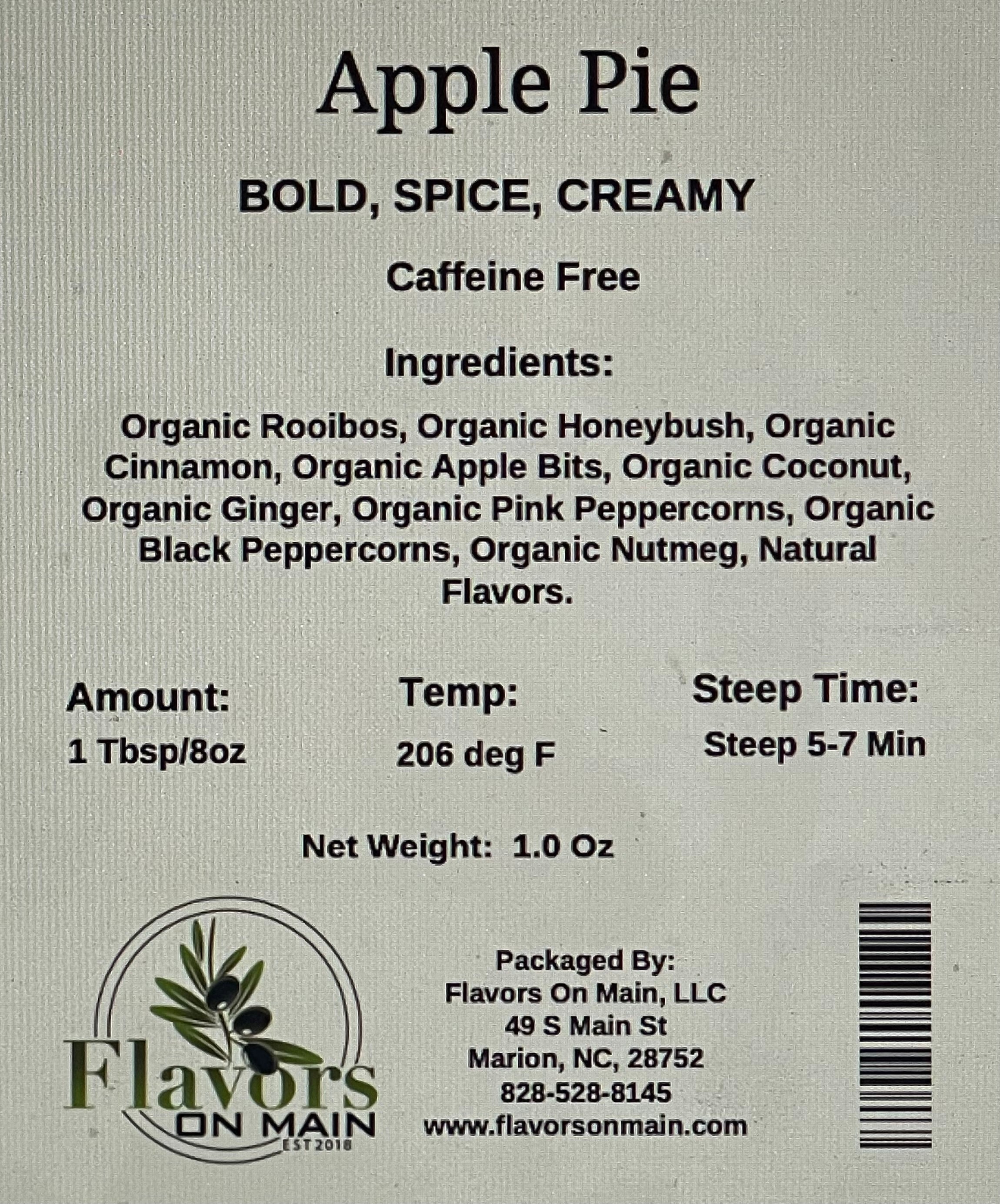 Ingredients: Organic Rooibos, Organic Honeybush, Organic Cinnamon, Organic Apple Bits, Organic Coconut, Organic Ginger, Organic Pink Peppercorn, Organic Nutmeg, Natural Flavors *Contains tree nuts (Pink Peppercorn & Coconut)