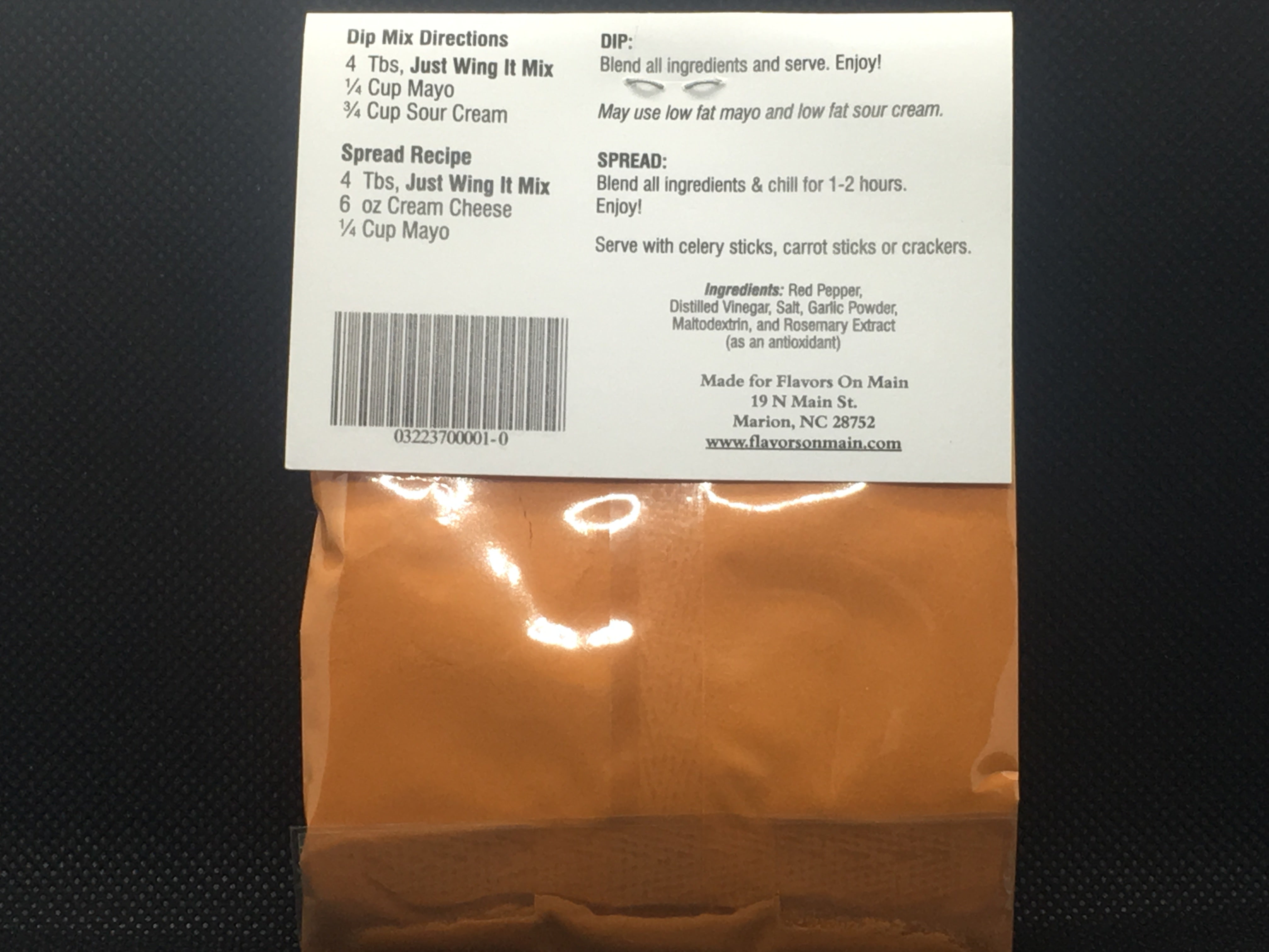 Blend 4 Tbs of Just Wing It Mix, 6 oz Cream cheese, and 1/4 cup mayo in a bowl. Let chill for 1-2 hours.