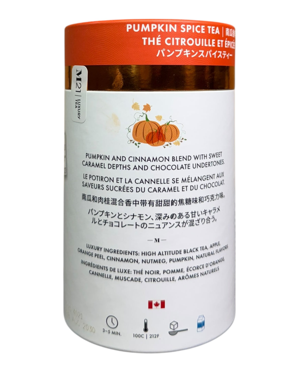 Luxury Ingredients: High-altitude black tea, apple, orange peel, cinnamon, nutmeg, pumpkin, natural flavors