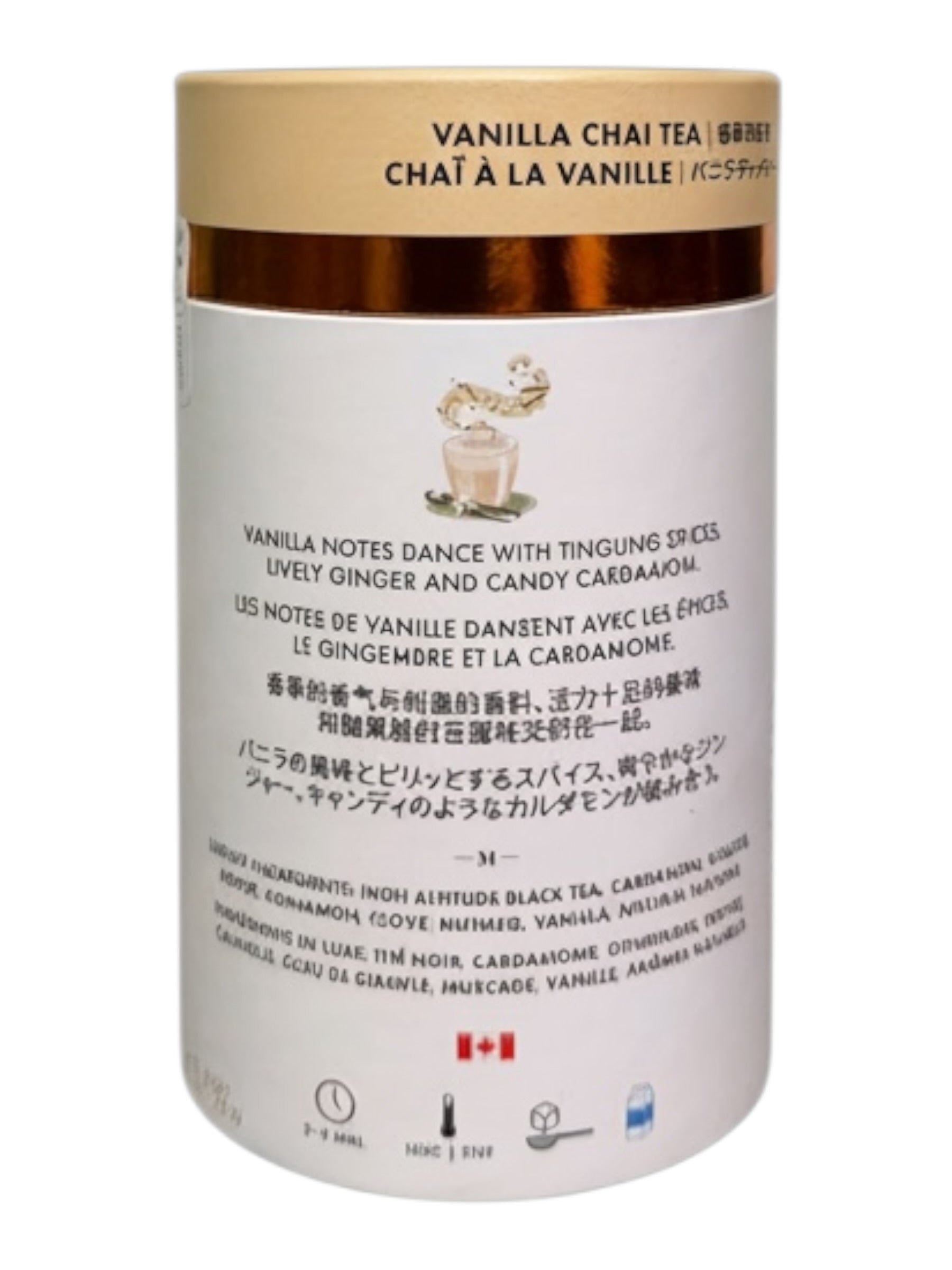 Luxury Ingredients: High-altitude black tea, cardamom, ginger, pepper, cinnamon, clove, nutmeg, vanilla, natural flavors