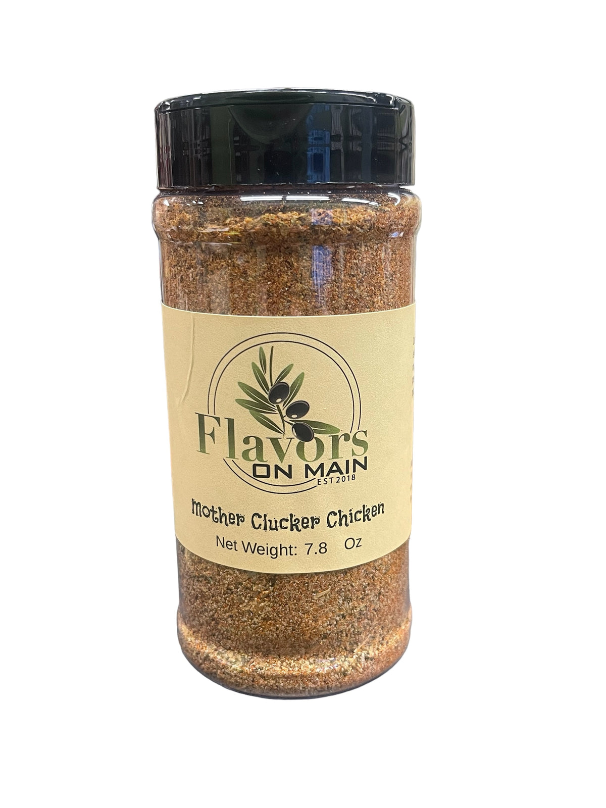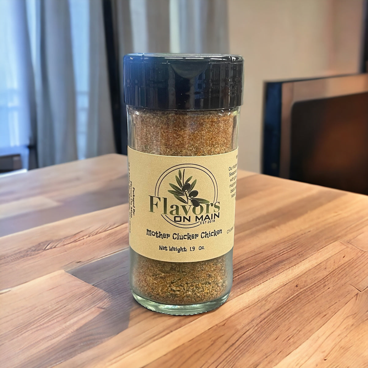 Our Mother Clucker Chicken Seasoning is hand blended with garlic, thyme, onion, marjoram, sage, paprika, black pepper, and New Mexico Lumbre chile powder.