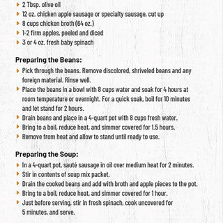 Inspired by crisp autumn days and the comforting aroma drifting from country kitchens, our Vermont Farmhouse Apple, Sausage & Bean Soup brings a bit of New England warmth to your table. This unique soup is a rustic blend of colorful legumes and aromatic seasonings, lightly touched with curry for depth and balance.